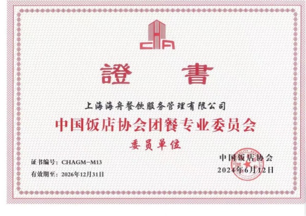 6月12日,海舟公司榮獲“中國飯店協(xié)會團(tuán)餐專業(yè)委員會委員單位”